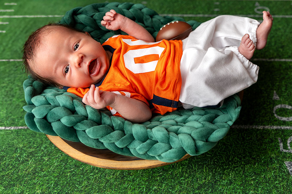 Many proud parents love incorporating Denver Broncos blue and orange colors into their newborn portraits. Custom newborn football uniforms, wraps, and football-style props help create a unique sports-inspired portrait that celebrates family team spirit.
