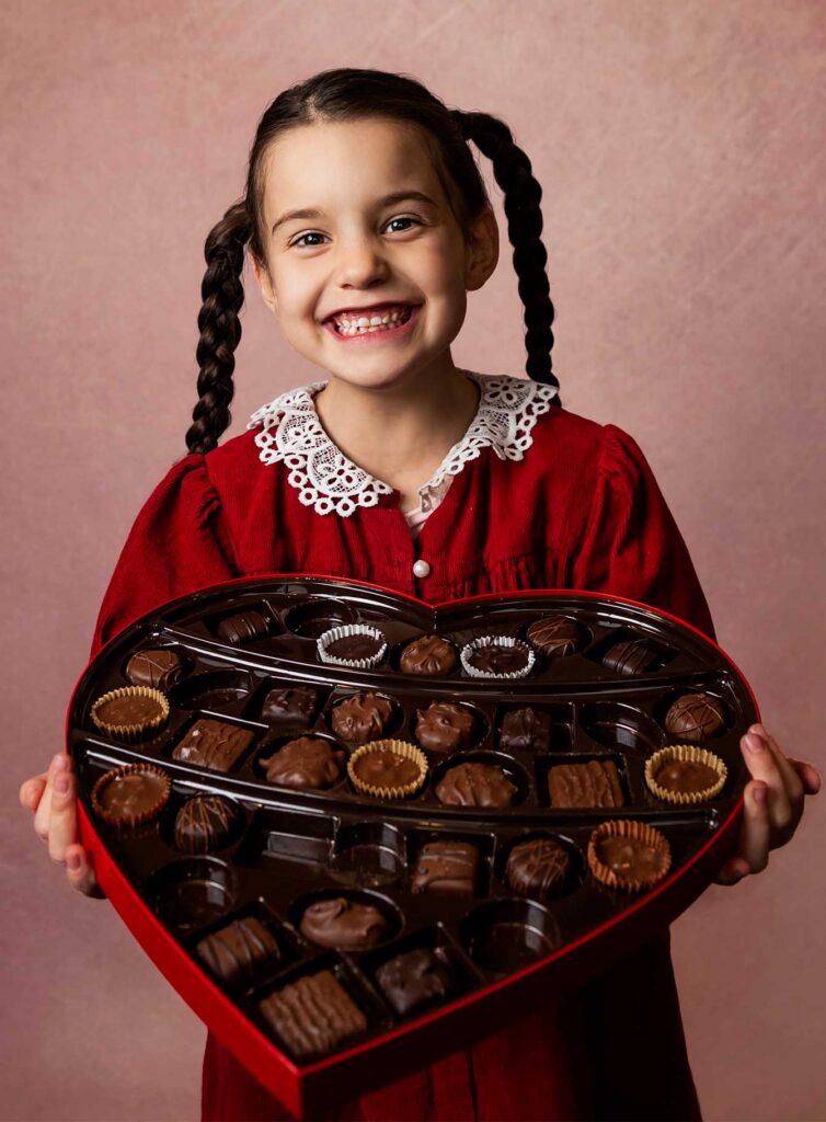 A professional studio environment is especially valuable for children’s Valentine sessions because it provides controlled lighting, comfort, and thoughtful styling.