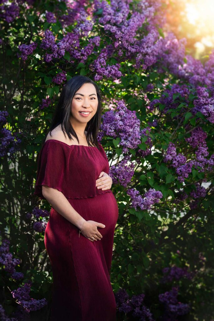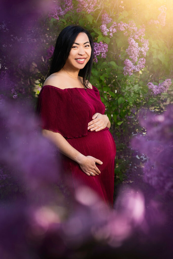 Unlike traditional outdoor sessions that rely completely on weather and public locations, my property offers exclusive access to blooming lilacs just steps away from my professional studio. We begin your maternity session indoors in my luxury studio space — where lighting is controlled, gowns are styled, and every detail is thoughtfully curated. Then, within moments, we step outside to capture breathtaking outdoor portraits surrounded by seasonal blooms.
